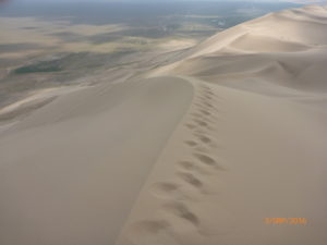 No a pak ta vysněná duna. Duna, která má délku přes 100 km a výšku od paty po hřeben 220 m. Nezdá se to nijak hrozné převýšení, ale v tom horku je to vražedný výstup.