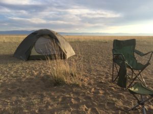 Dvě místa u jezera a žádné se nám nelíbilo, takže jsme poodjeli kousek dál do stepi a postavili stany. Tady teda další den nebudeme. Pojedeme dál.