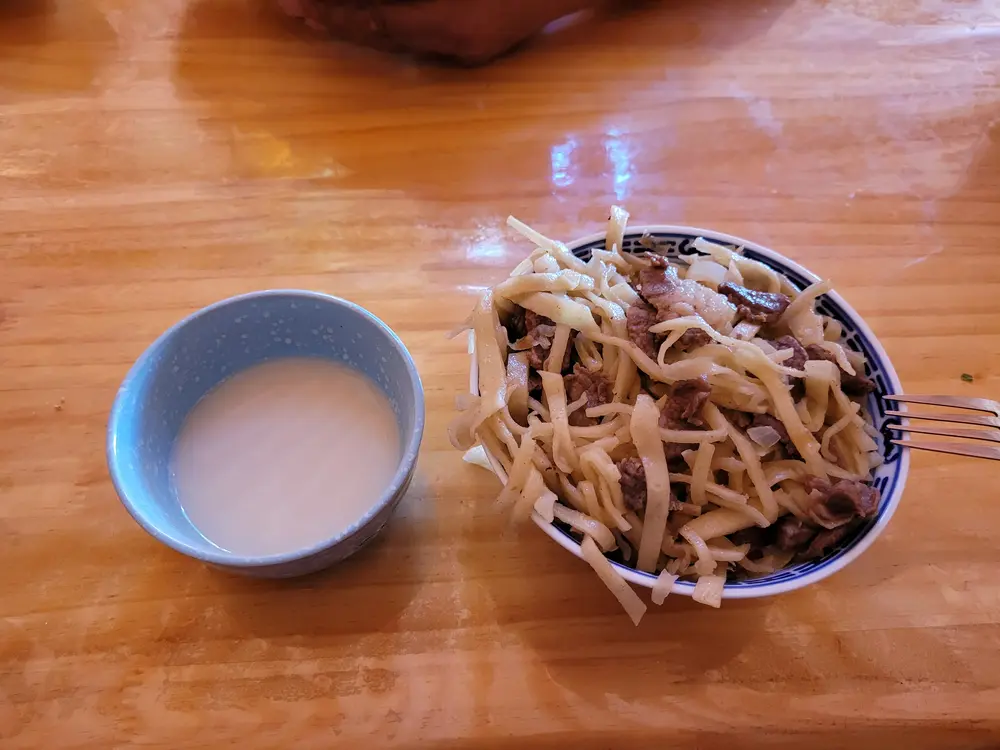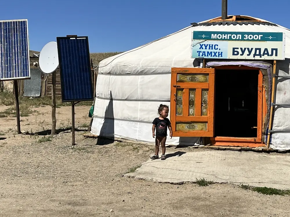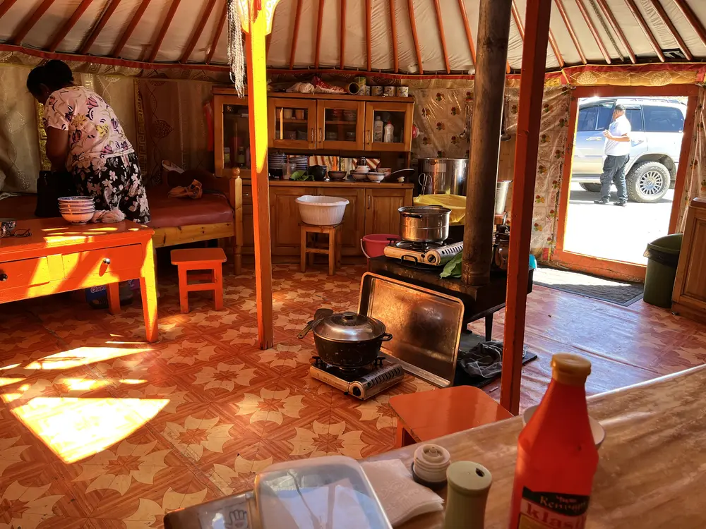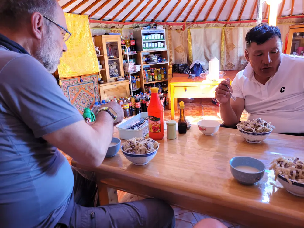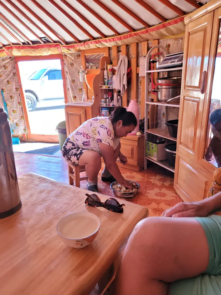 Jako, pro mně je trochu nepochopitelné, že je tady jedna paní, evidentně babička malého caparta a pak už není mezi jurtami nikdo. Rodiče jsou pravděpodobně někde se stádem a vrátí se až večer. Paní se nás zeptala co si jako dáme na oběd a poté co jsme si objednali mongolské nudle se zeleninou a masem „cojvan“, pustila se do práce. My jsme se pohodleně usadili a dali si teplý „suté caj“, což je čaj s mlékem a solí.