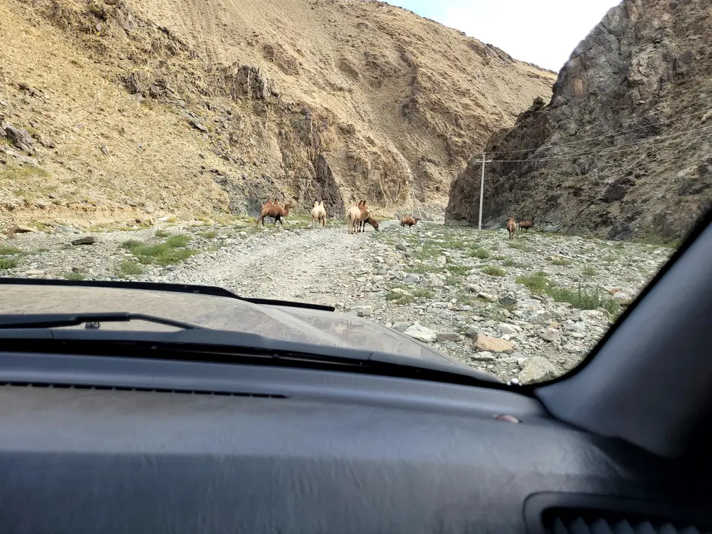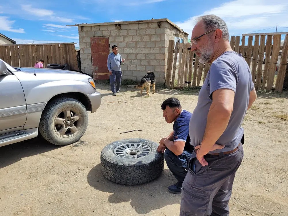 Cestou necestou jedeme dál. Dobrým znamením v Mongolsku jsou dráty. Ty jasně znamenají, že na jejich konci je nějaké sídliště. Sídliště, které potřebuje dráty je větší, čili okresní = somon. Somon má okresní správu, obchod, školu, benzínovou pumpu a dvorek kde je pneuservis. Velbloudi sice nic takového nepotřebují, ale zase jsou vděční za každou zeleň a považte oni žerou i ty trnité keře.