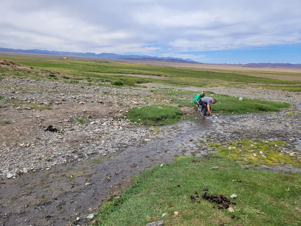 Mongolsko je plné jezer. Úžasný je v tomto smyslu západ Mongolska. Jedno krásnější jezero vedle druhého. Jinde je ale situace poněkud jiná. Tato jezera jsou většinou velmi plitká, někdy jsou jen dočasná a ve vrcholném létě tu bývá zasolená bažina. Jsou v naprosté většině případů bezodtoká, takže stálým odparem se z jezer stávají jezera slaná a mnohdy ani zvířata k vodě nechodí. Tady teda chodila. Kolem břehu byly jasné stopy. Voda byla ale hnusně zelená a někteří z nás si ani nevyzuli boty ze strachu, že ty řasy nejsou vůbec zdravé. Ani vůně tomu nenasvědčovala 🙁