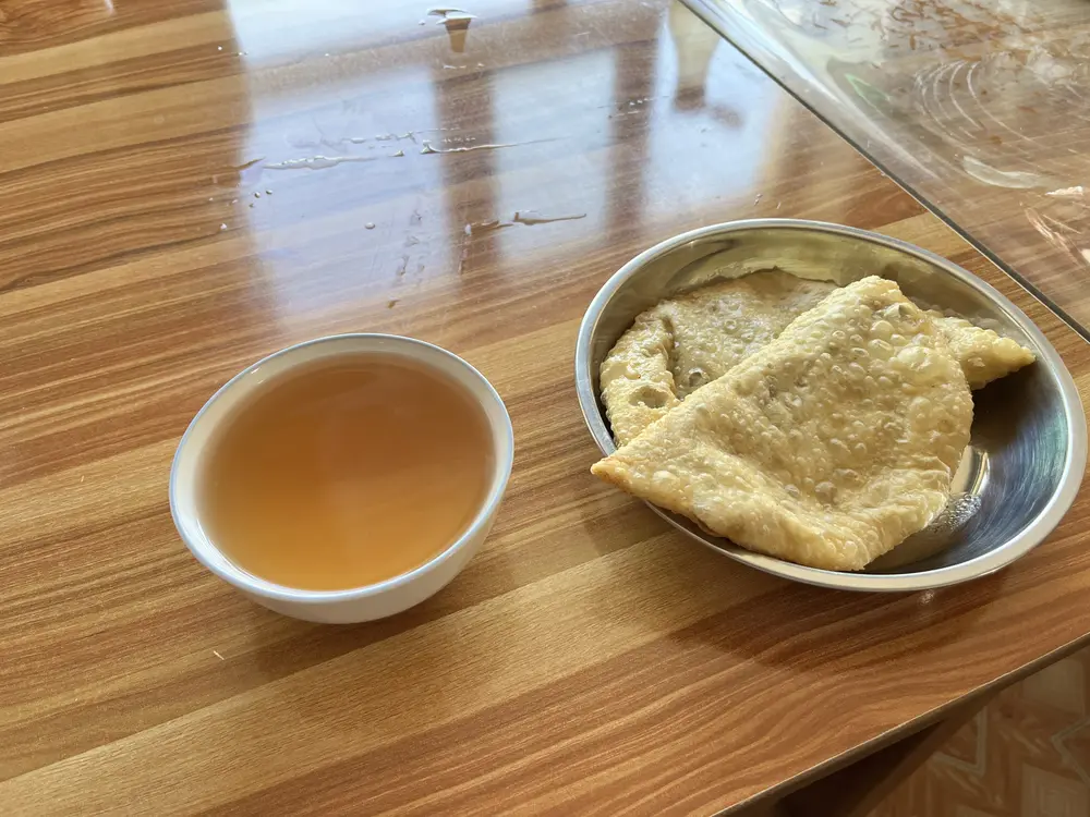 Tady jsme si dali další populární mongolské jídlo. Chušury. Placka z nudlového těsta naplněná na drobno nakrájeným masem. Mongolové maso nemelou, ale nakrájí ho na velice drobné kousíčky. Ochuceno skromně. Koření se tady začalo prosazovat až hodně pozdě. V podstatě si to vyžádal cestovní ruch. Cizinci přece jenom rádi více kořeněné. Mongolové používají hlavně cibuli. A co k tomu? No jasně – suté caj 🙂