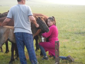 Dojení koní bylo docela zajímavé. Kobyla nepustí mléko dokud si necucne hříbě. Hříbata jsou přivázaná a tak kobyly nikam neutečou. Postupně se odváže hříbě, přivede ke kobyle a systémem cucnout, podojit a malinko nechat pro mrňouse se dojí jedna kobyla za druhou. Volná hříbata i mámou potom odchází, ale né daleko. Byl jsem překvapen, kolik mléka se z jedné kobyly nadojí. Mým odhadem 2 až 3 litry.