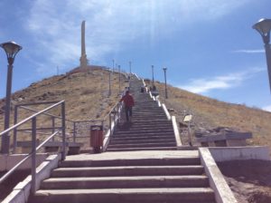 Ze silnice, která vede kolem řeky se nastupuje na nekonečné schodiště. Ani letos jsem schody nepočítal, protože mě to, jako vždy, napadne až když začnu ztrácet dech 🙂 Paradox je ten, že na Zajsan se leze, jak jinak, když je hezky a sluníčko do vás pere na plné pecky. (Malá básnická licence :-). Navíc vlhkost vzduchu, v Mongolsku vždy nízká, byla tentokrát 30%.