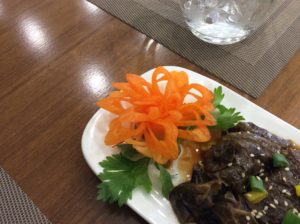 Objednal jsem si plátky z hovězího srdce (hovězí srdce mám moc rád) a opečené papriky to je ten menší talířek s ozdobou z mrkve ve tvaru květu. Ta jim trvala nejdéle. Takže srdce bylo studené, papriky byly studené (zato ďábelsky pálivé) a kámoška si dala kuřecí. To je vždycky napříč rozsekané kuře i s kostmi. To bylo taky studené, jen miska kantonské rýže se zeleninou byla vlažná a to nejen miska, ale dokonce i ta rýže 🙂